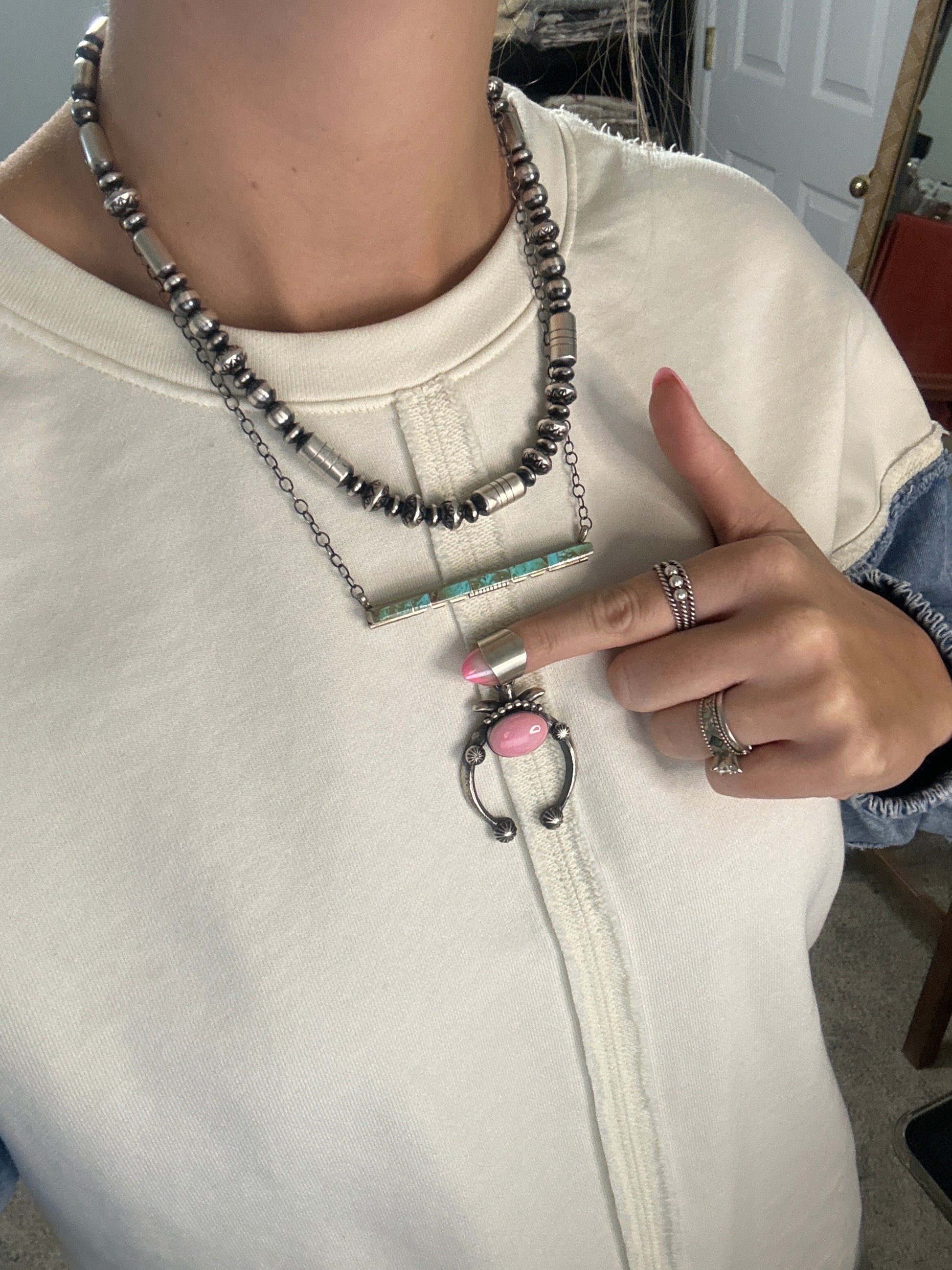 - chimney butte pink conch naja pendant - signed and stamped. genuine stone. will fit 10mm pearls. sterling silver. measures 3.5" from top of bail x 2" wide.