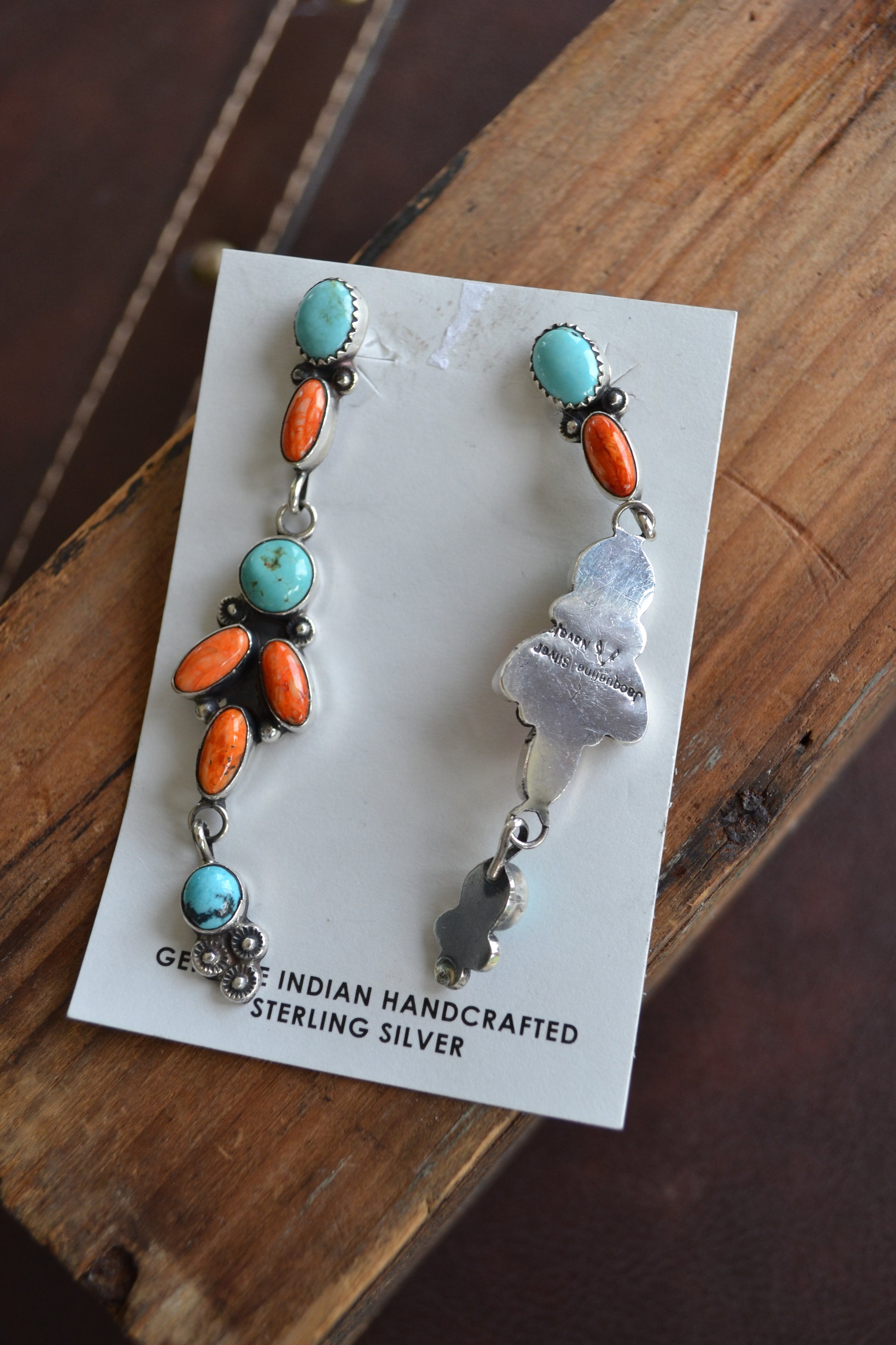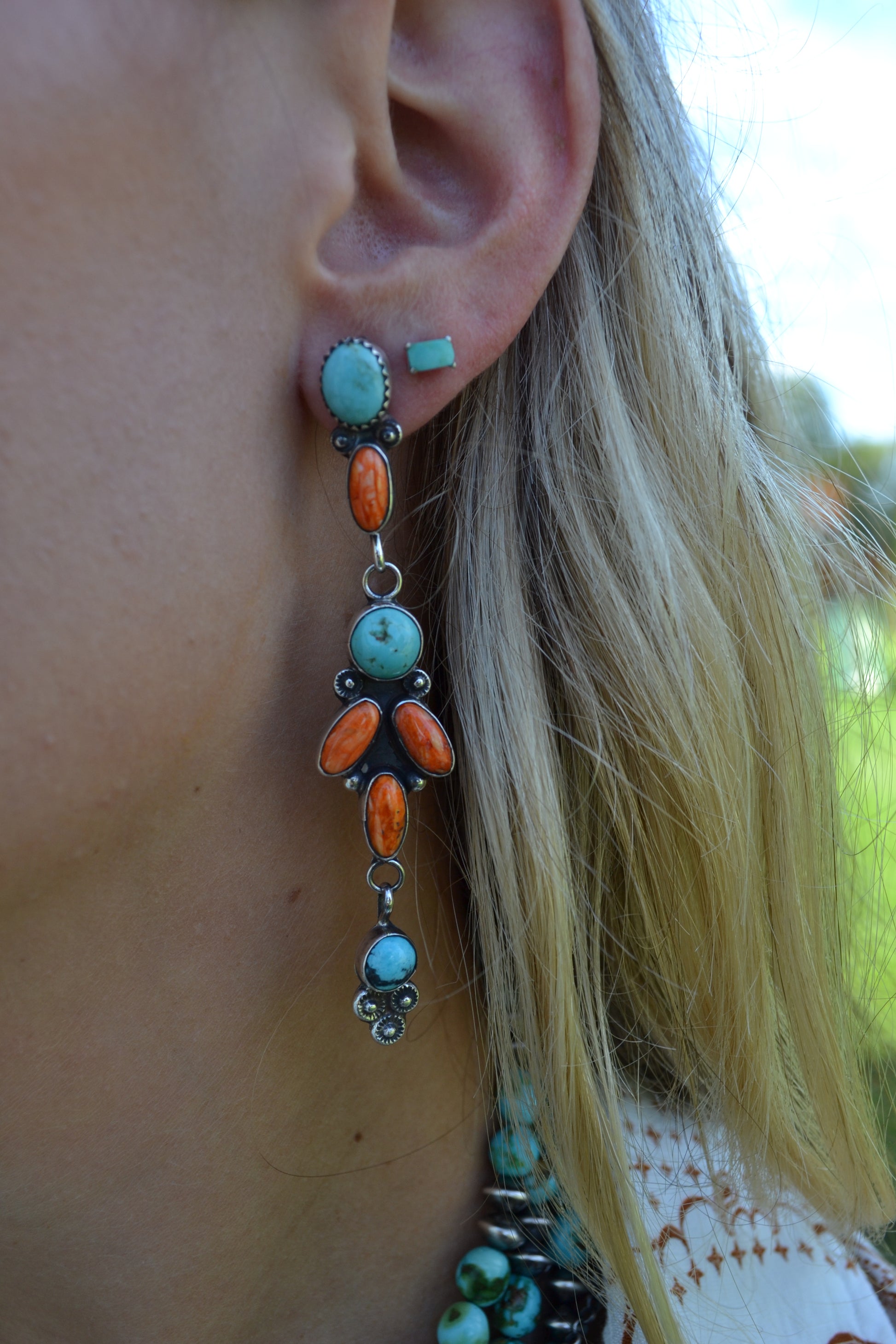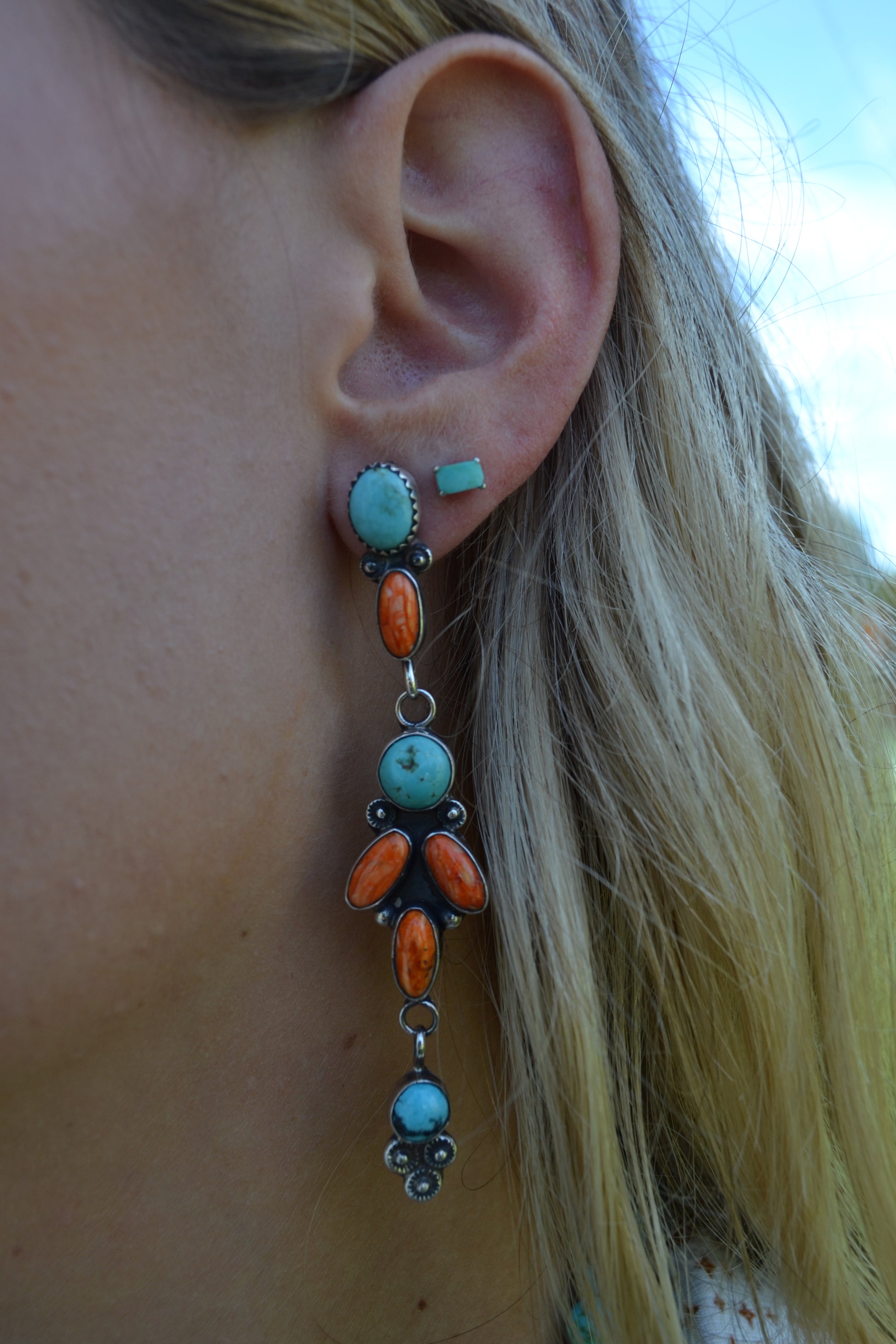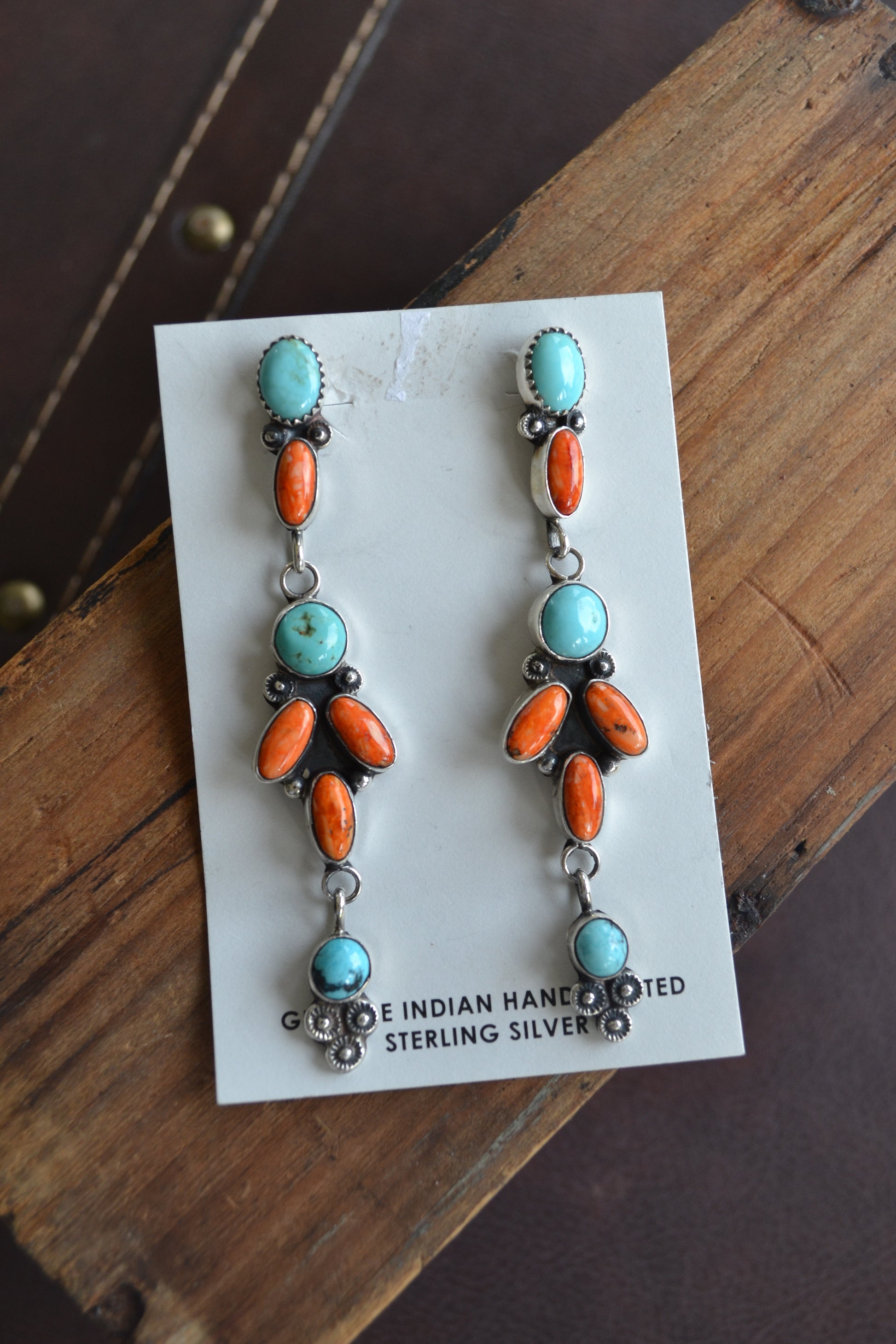 Jacqueline Silver Orange Spiny and Turquoise Dangle Earrings