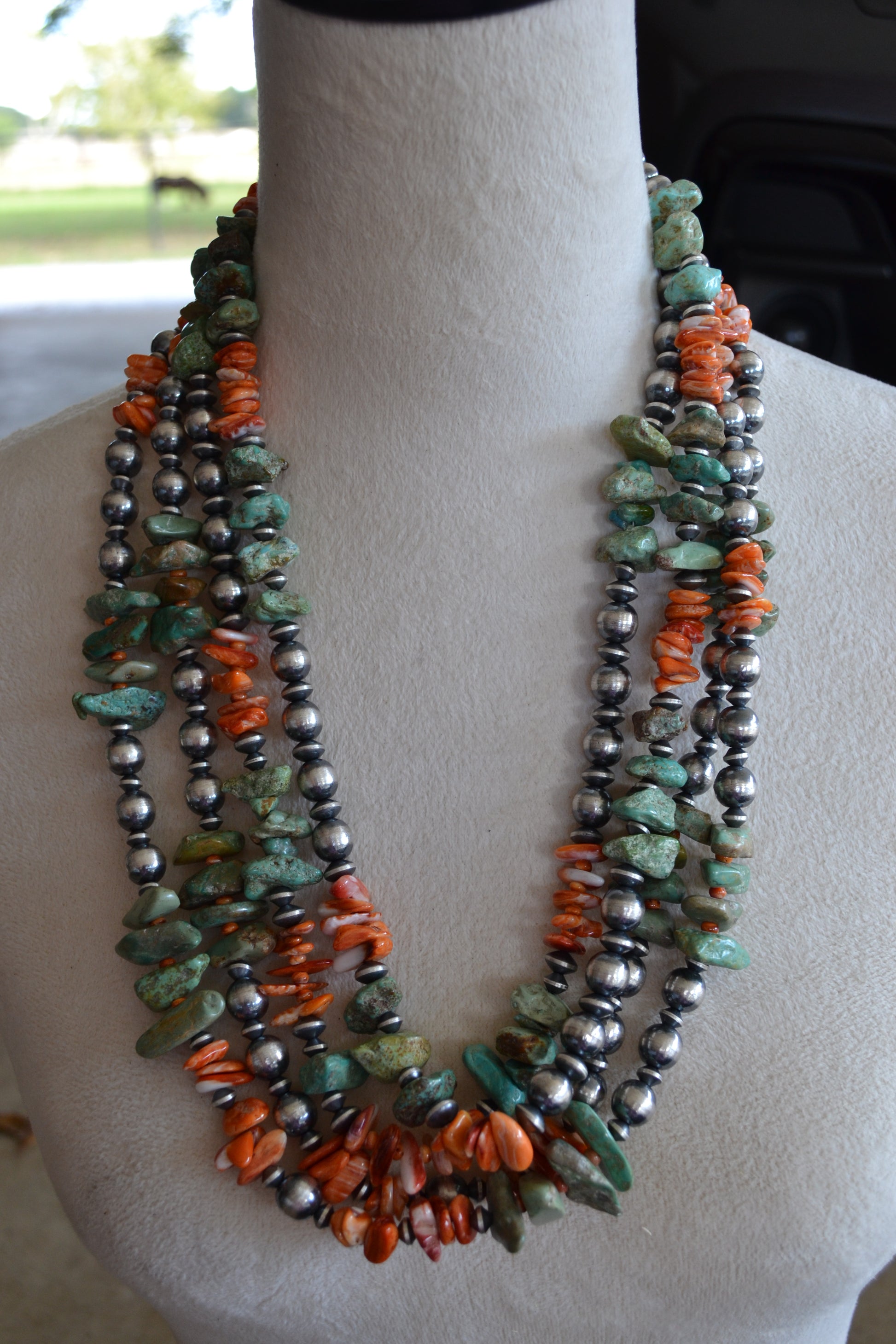 Handstrung Chimney Butte Orange Spiny & Kingman Turquoise Nugget Chip Graduated Pearls
