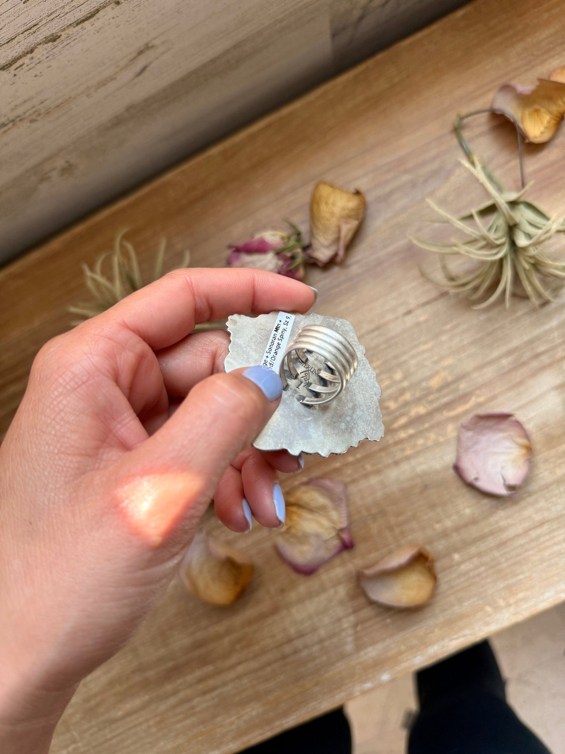 This sterling silver mosaic cluster ring by artist Shay Pfeiffer is an exceptional showcase of color and craftsmanship. The design features a striking mix of Sonoran Mountain Turquoise, Blue Ridge Turquoise, Purple Spiny Oyster, Orange Spiny Oyster, and Red Spiny Oyster, all expertly inlaid in a one-of-a-kind mosaic pattern. Each stone is hand-set, creating a vibrant, high-end piece that reflects meticulous silversmithing and attention to detail.