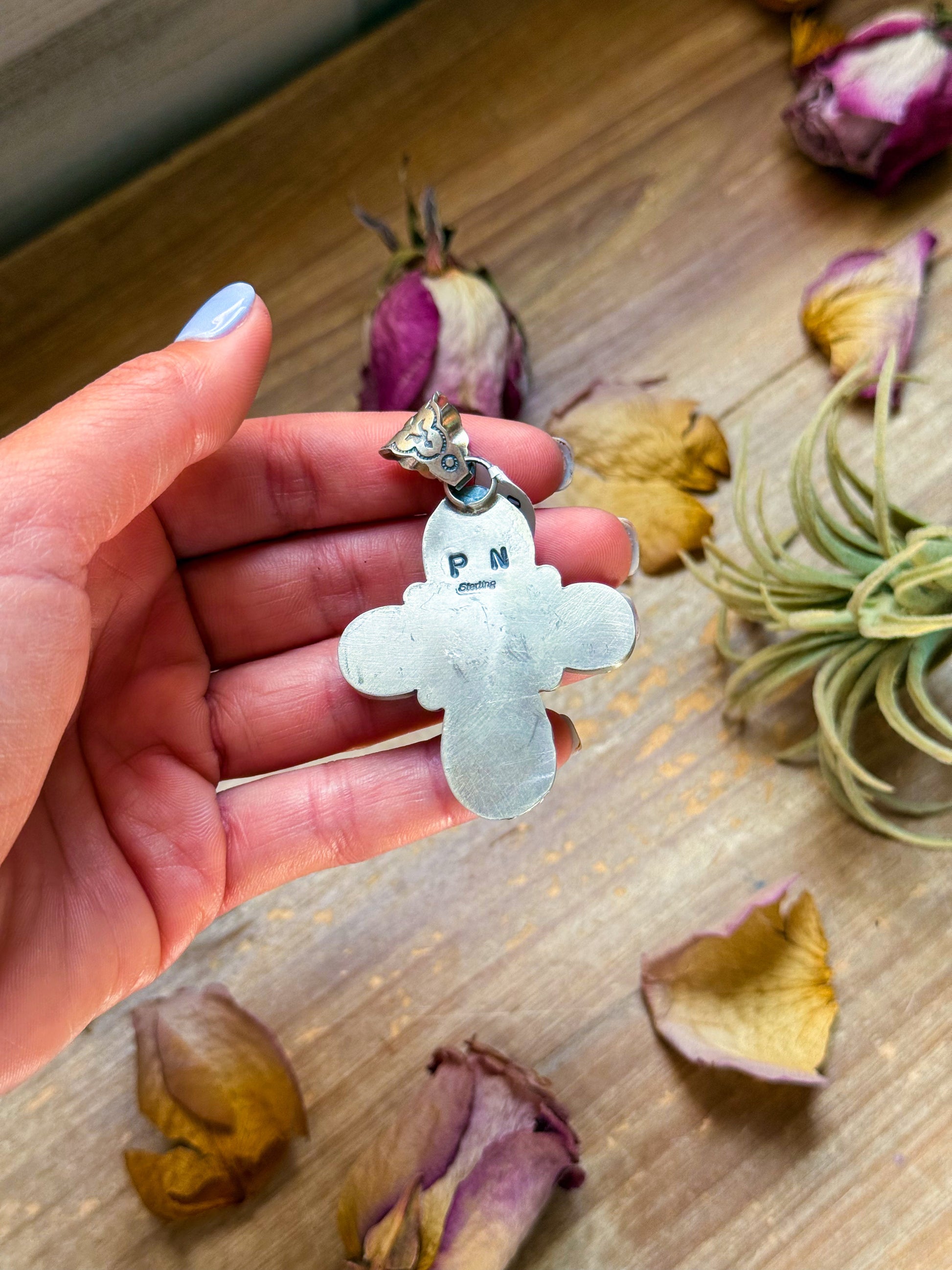 This Sterling Silver Green Turquoise Cross Pendant is a powerful symbol of Southwestern artistry, handmade in the USA by Native artist P. N.