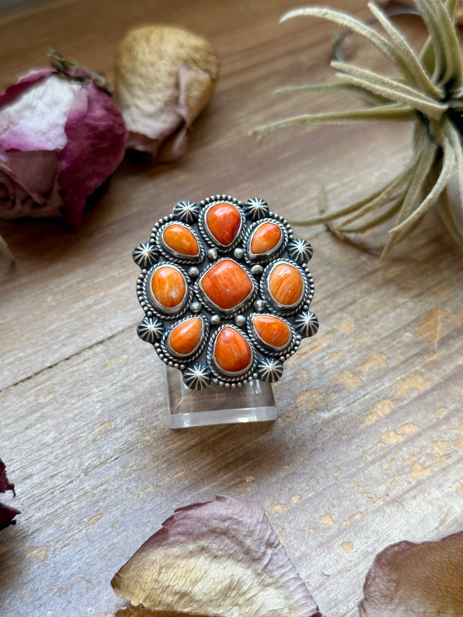This Orange Spiny Oyster Mosaic Cluster Ring is a stunning statement piece handmade by artist Shay Pfeiffer in solid sterling silver. The ring features a vibrant mosaic of genuine Orange Spiny Oyster stones, arranged in a bold cluster design that captures the warmth and energy of the Southwest. Each ring is stamped “Sterling” and marked with the artist’s hallmark, representing true craftsmanship and collectible quality. A show-stopping piece that adds color, artistry, and personality to any collection.