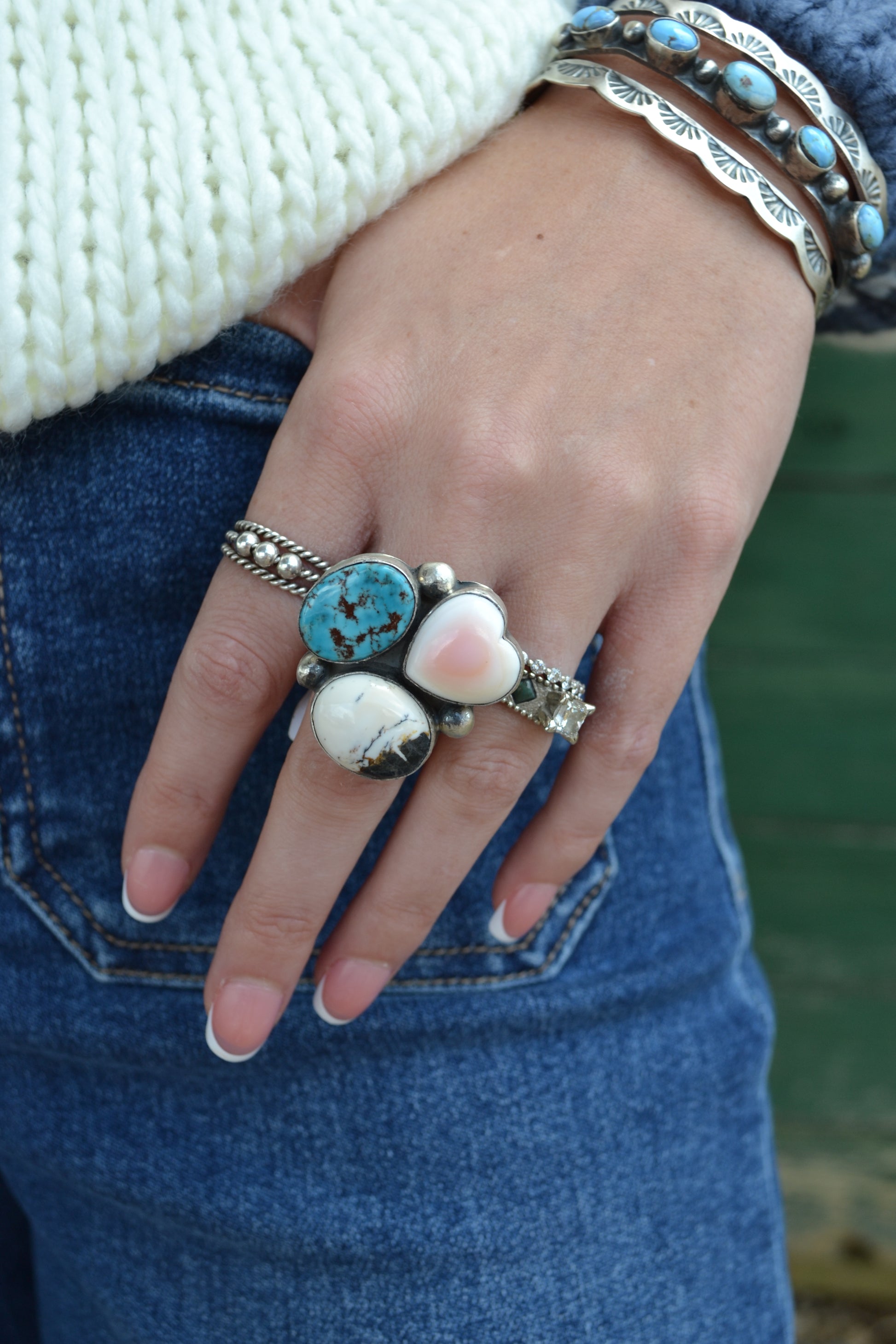 BJA Pink Conch Heart, White Buffalo, and Turquoise Heart Cluster Ring