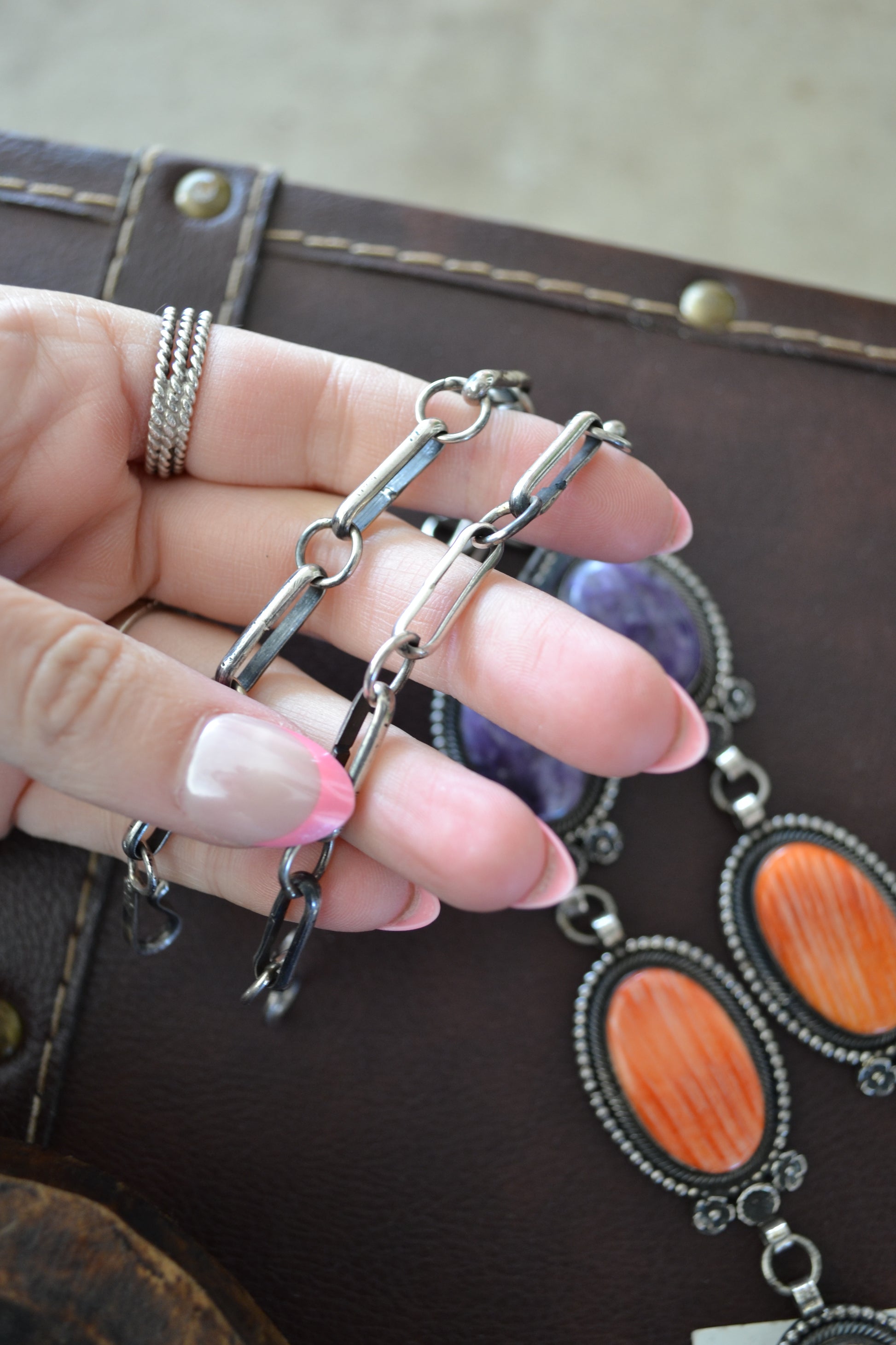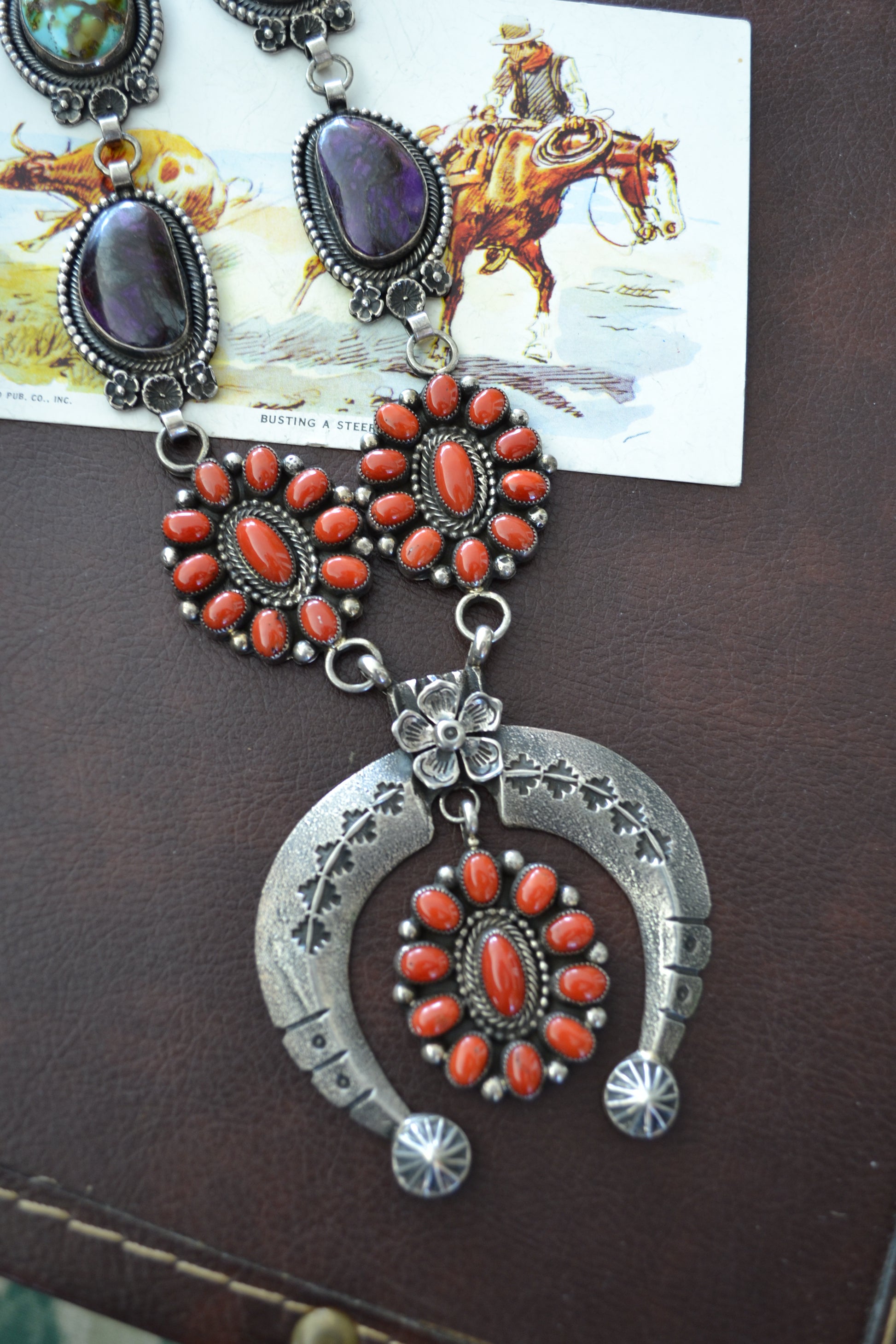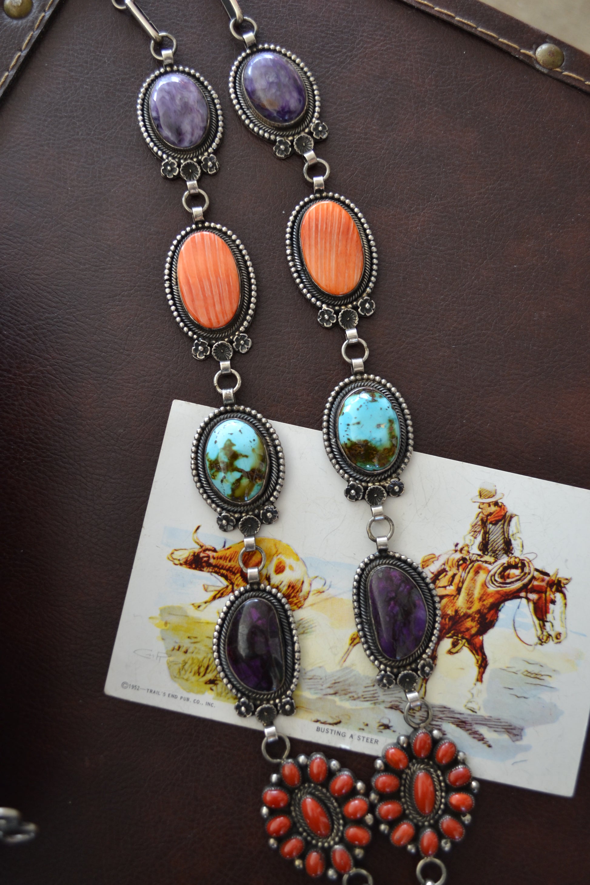 - purple sugilite, red coral, orange spiny, and turquoise.