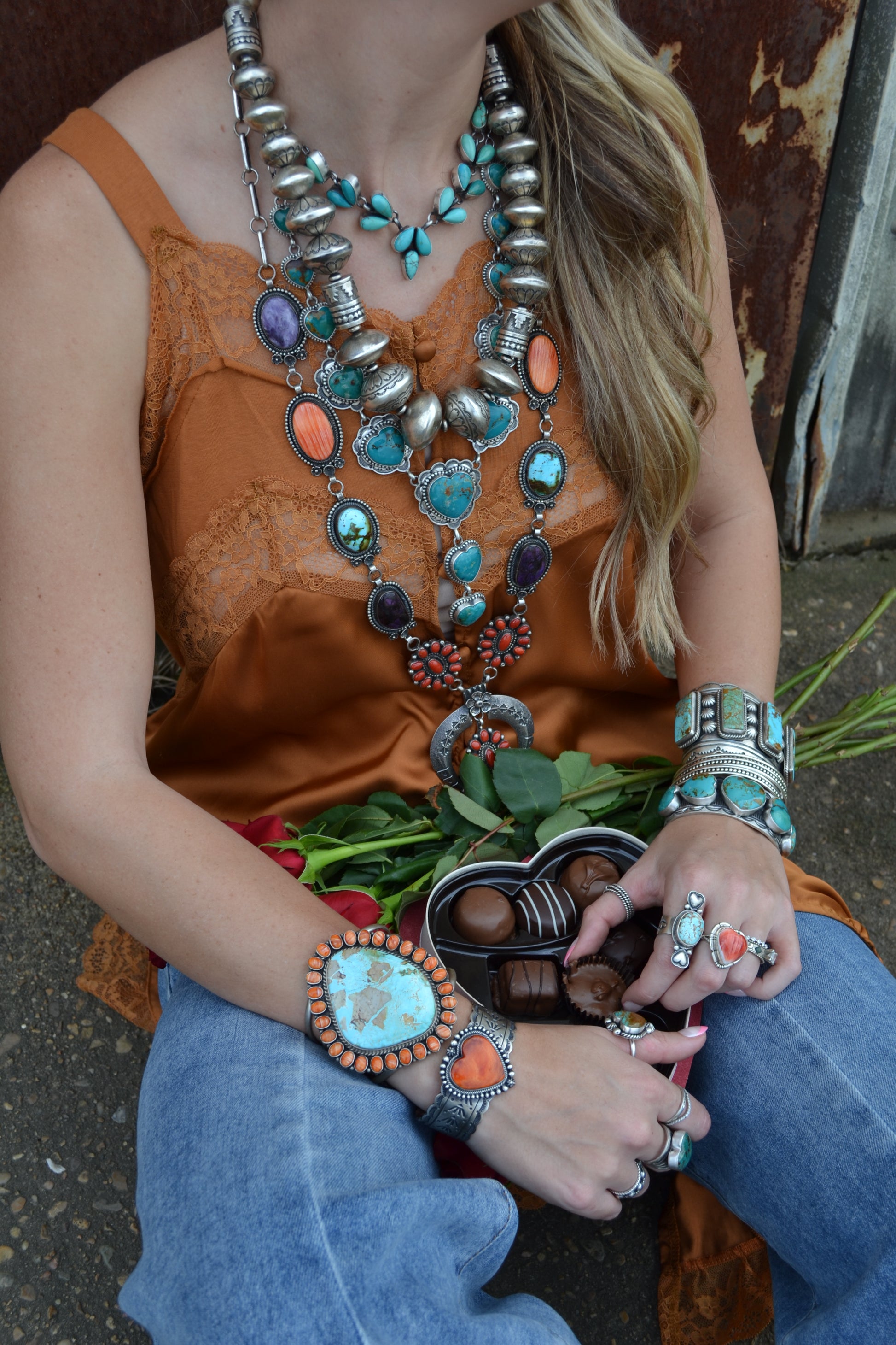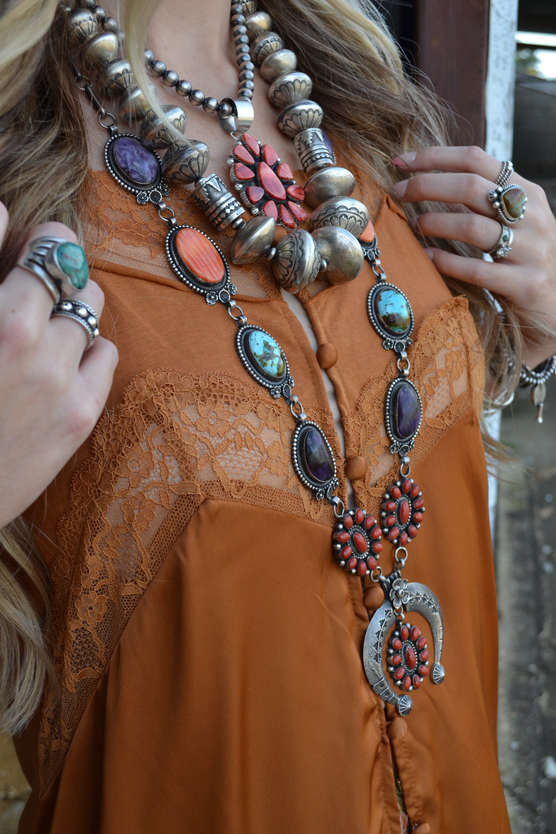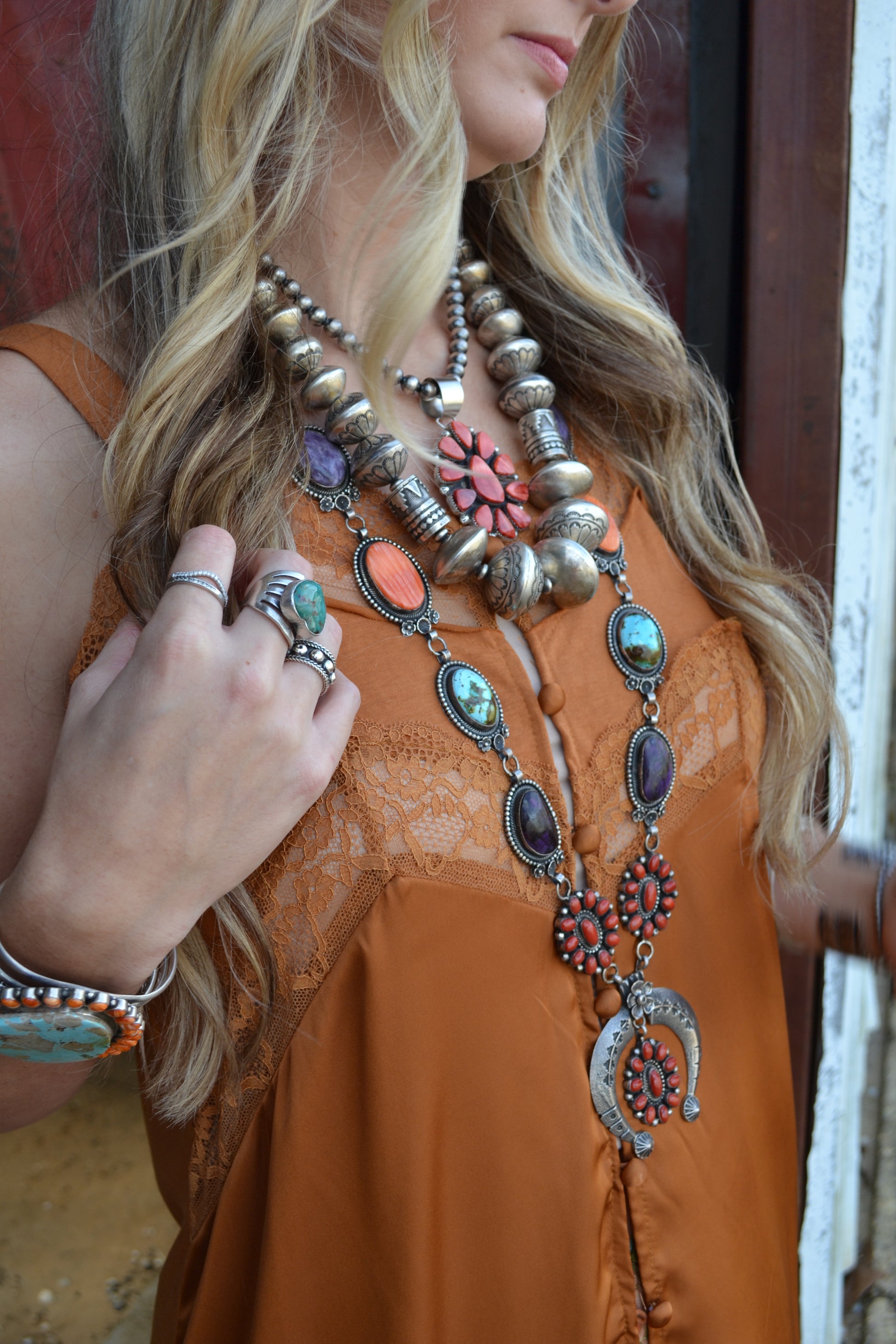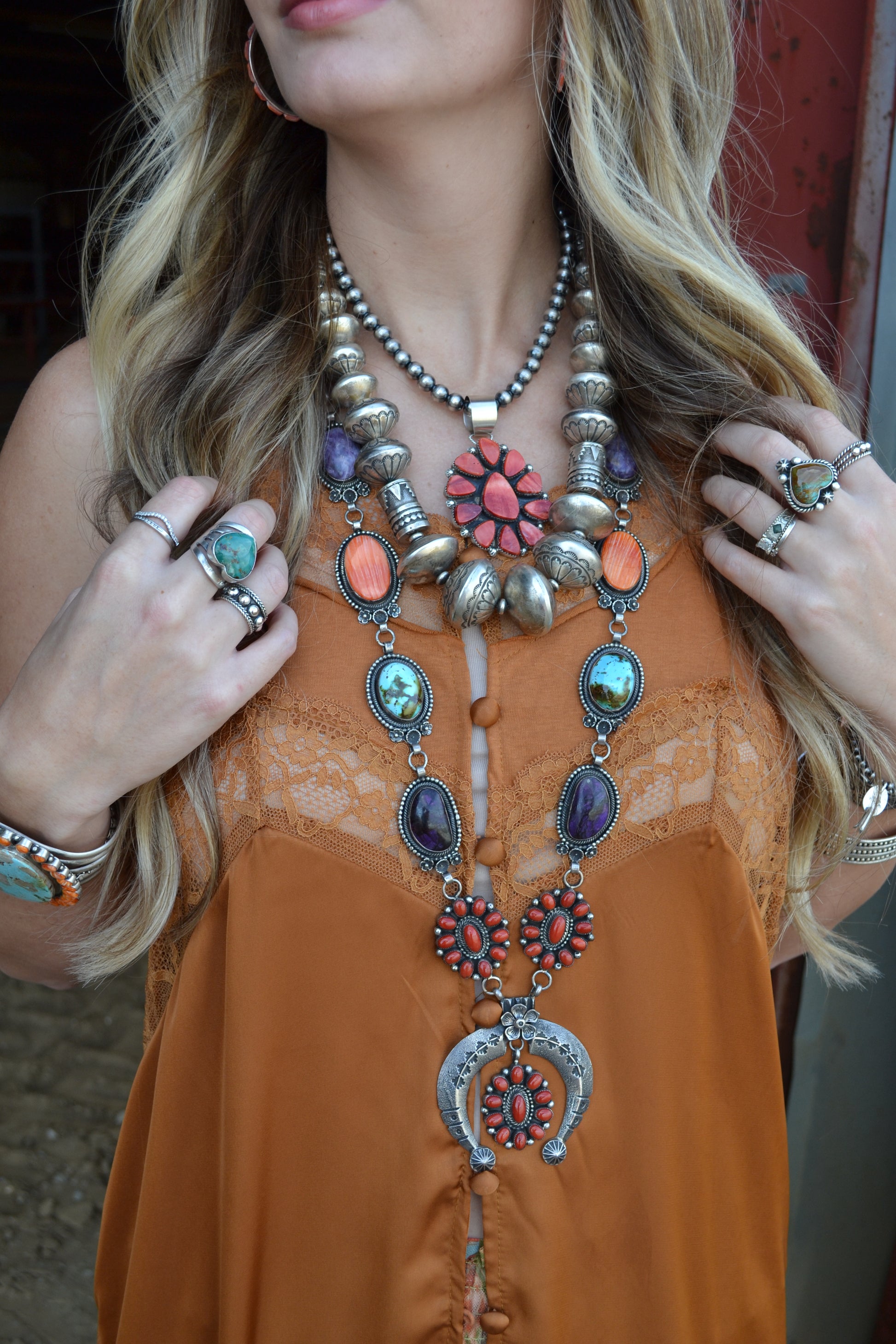 - purple sugilite, red coral, orange spiny, and turquoise.