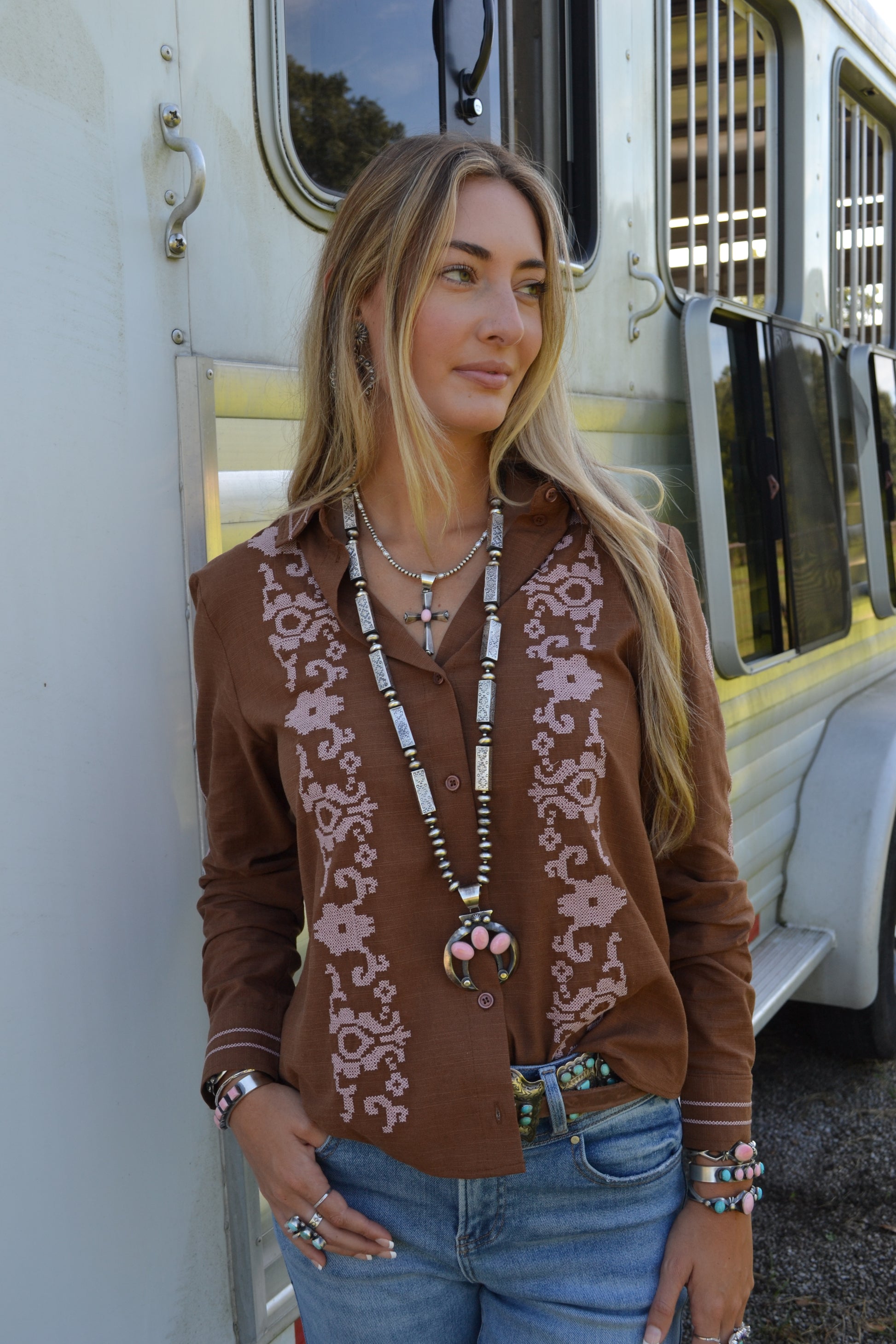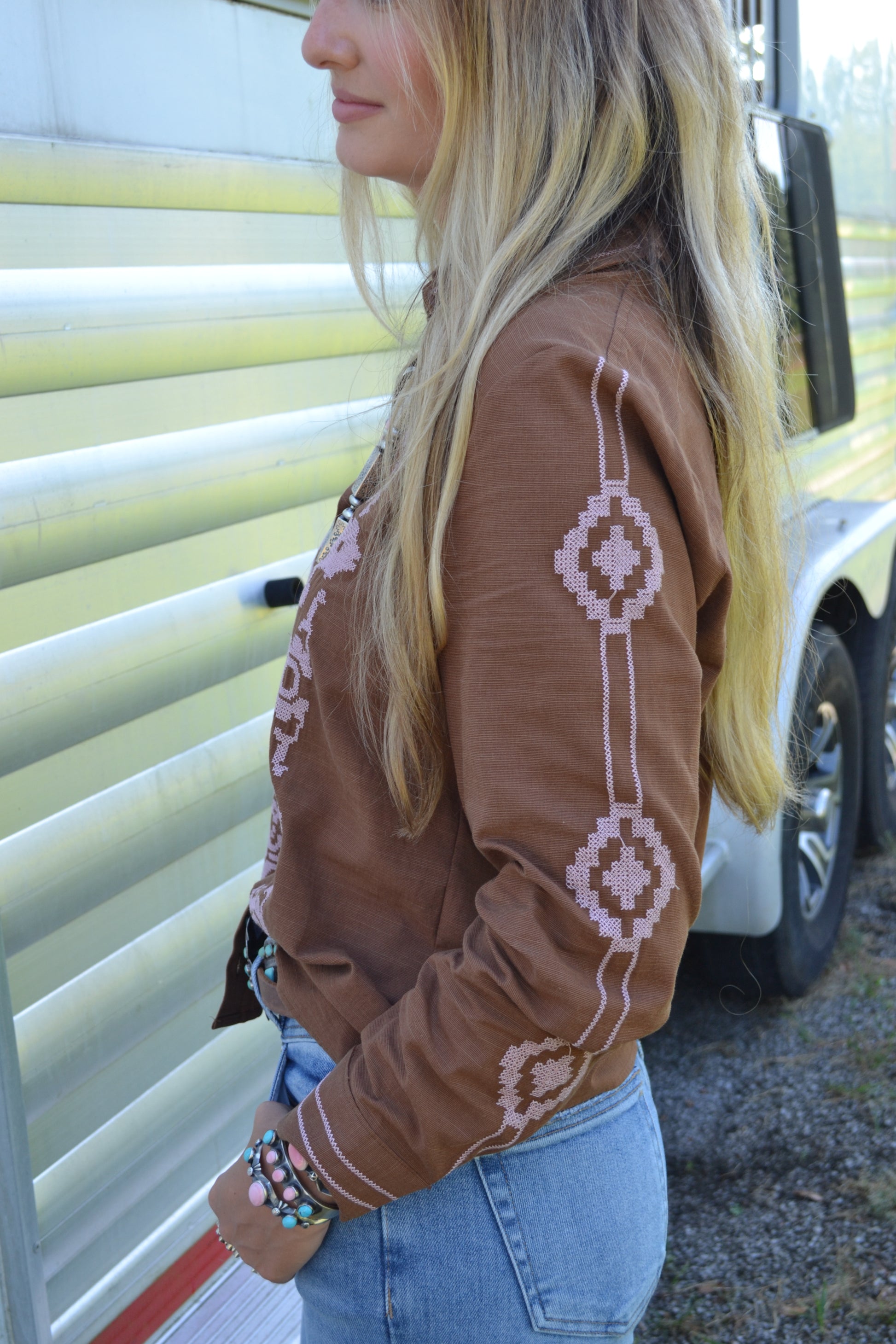 Brown and Pink Embroidered Long Sleeve Top